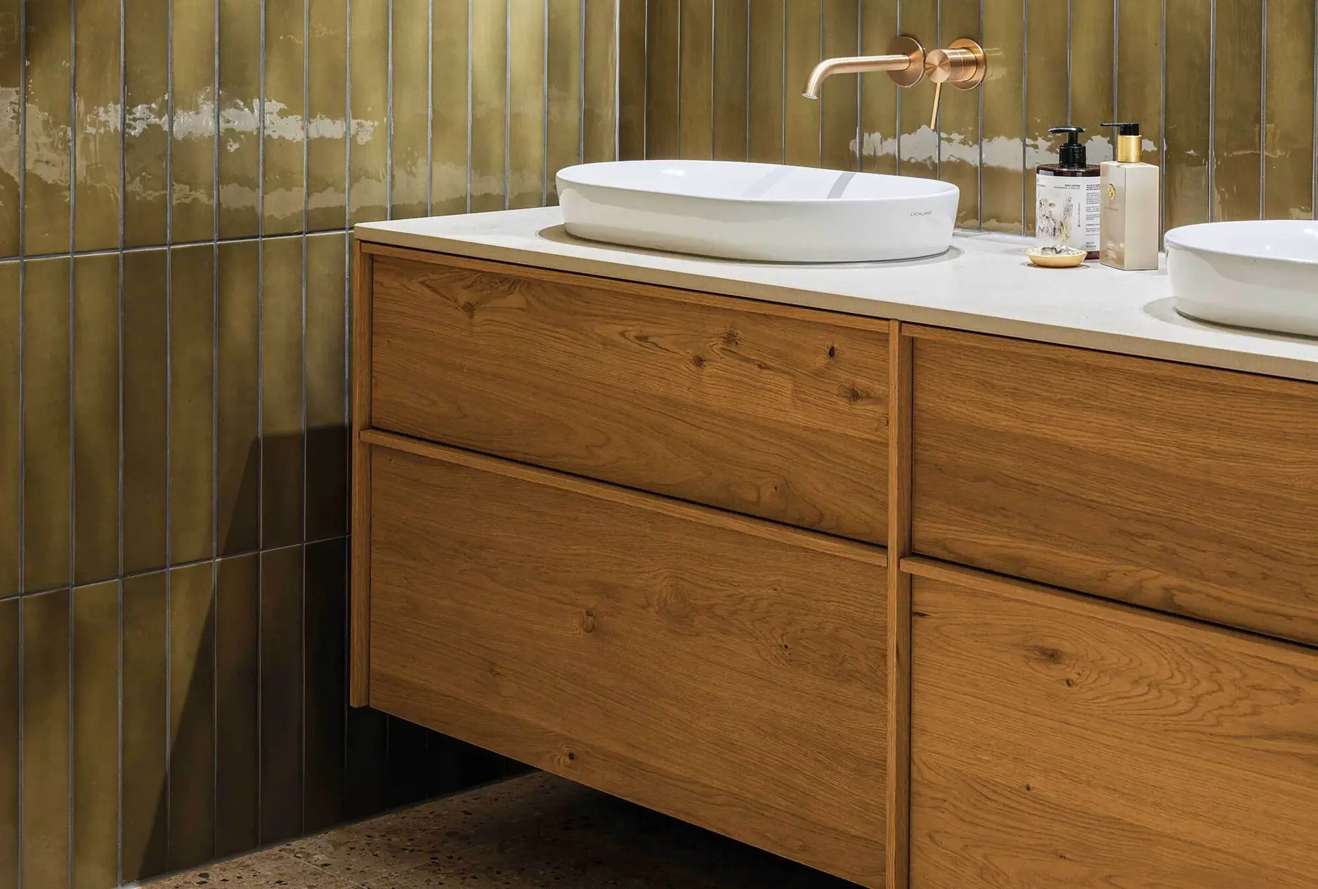 Badmöbel mit klarer Formensprache und schlichter nordischer Rahmenoptik. Die Rahmen bilden gleichzeitig die Griffe. Ausführung in edlem Eichenfurnier mit Maserung. Nischenablage (rechts im Bild) in gleicher Ausführung. Eigenentwickelter Einbau-Spiegelschrank in Messing eingefasst.