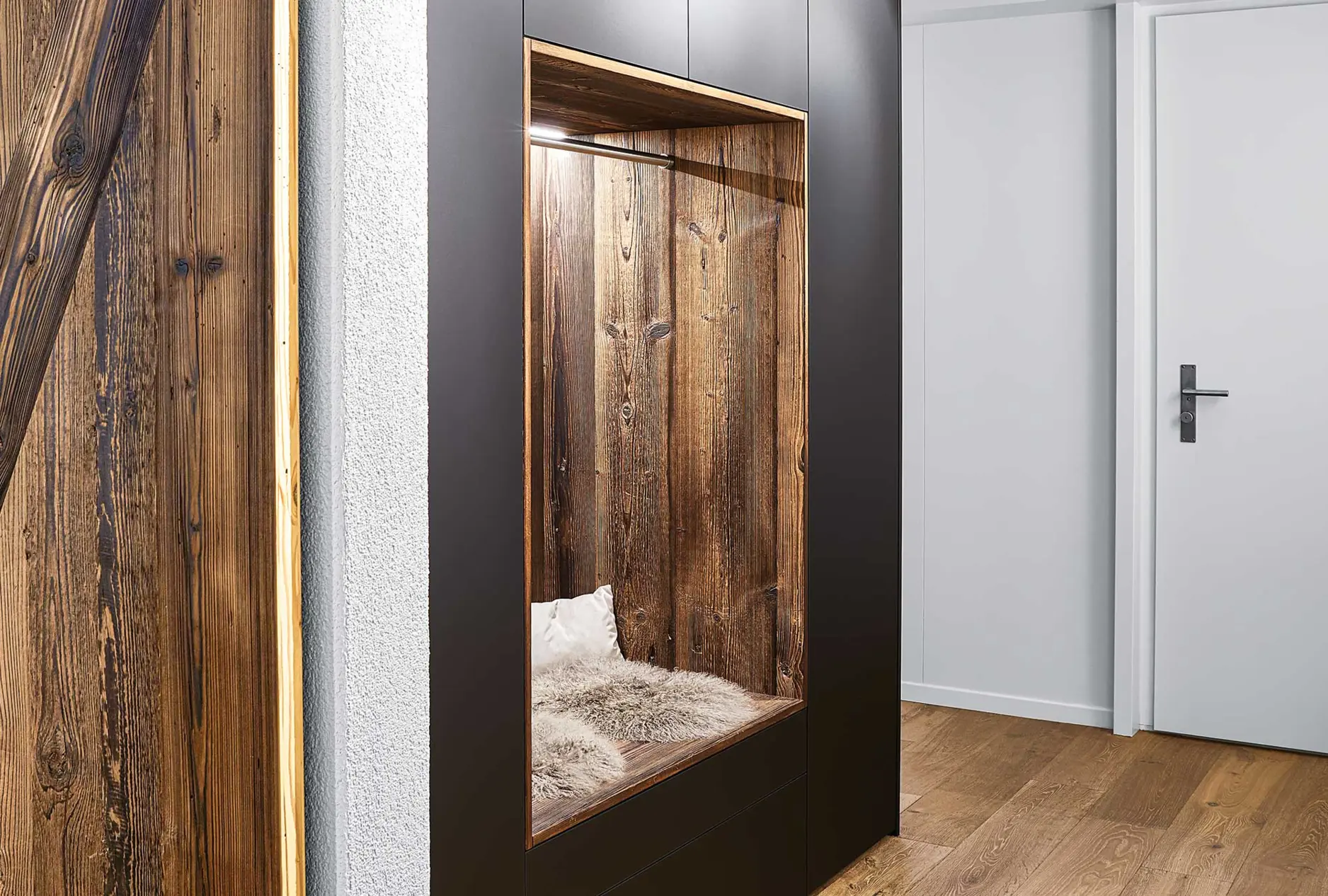 Nebst der Küche in Abtwil wurde eine grosse Schiebetüre aus Altholz speziell angefertigt und eingebaut. Dazu im gleichen Design eine Garderobe mit Nische in Altholz und Fronten in Fenix Nero.