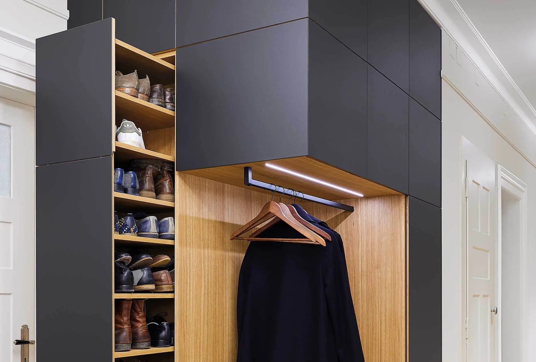 Eingangsbereich mit moderner, schlichter Garderobenanbau als Kontrast zur 110 Jahre alten Jugendstilwohnung. Fronten in Linoleum mit Holzkante und umlaufender Griffnut. Holzverkleidung in Nische fortgeführt und mit LED-Beleuchtung effektvoll ausgeleuchtet. Viel Stauraum und rundum unsichtbar integrierte Schubladen und Schränke.